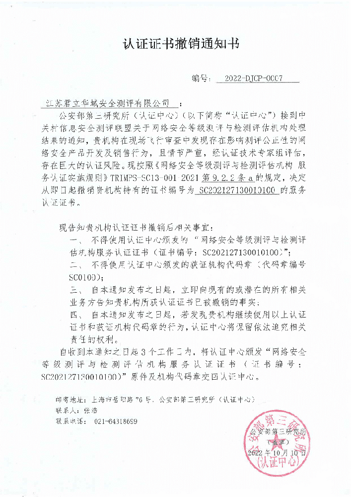 江苏君立华域安全测评有限公司等保测评资质被撤销